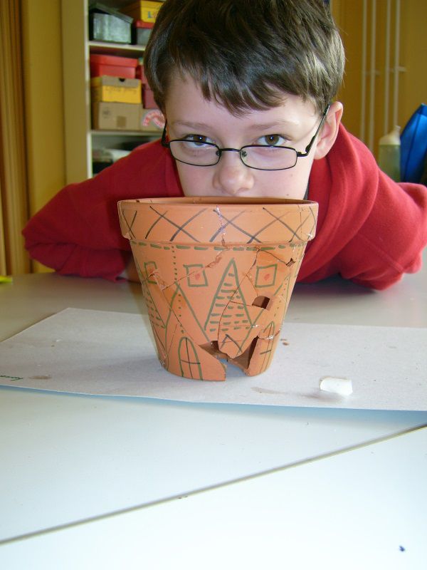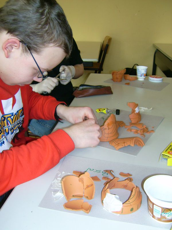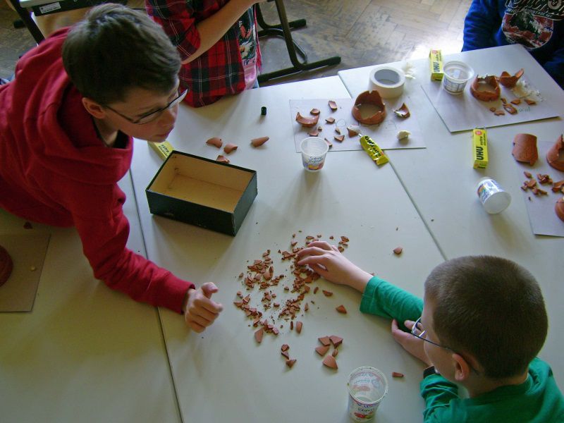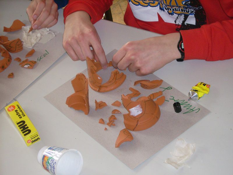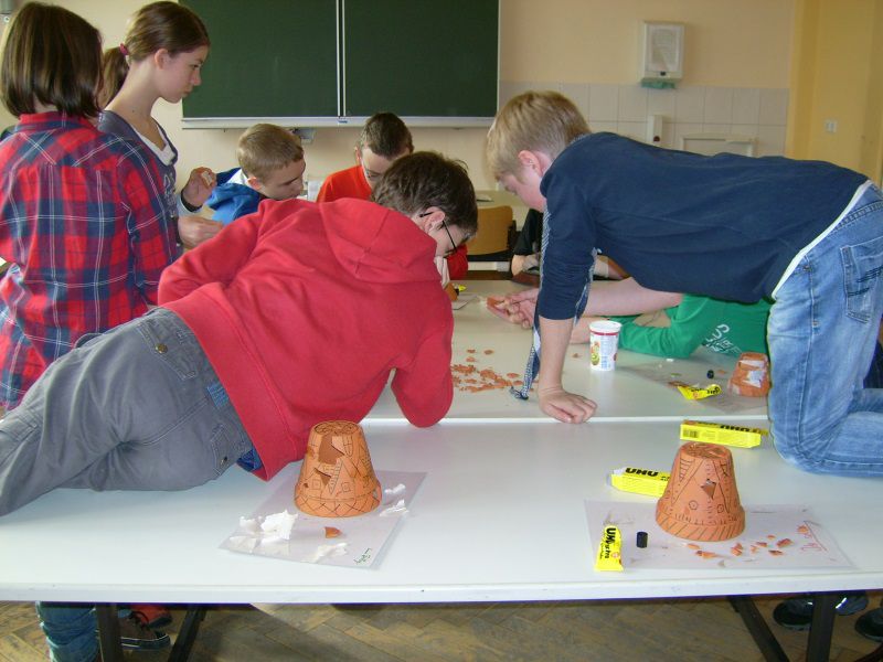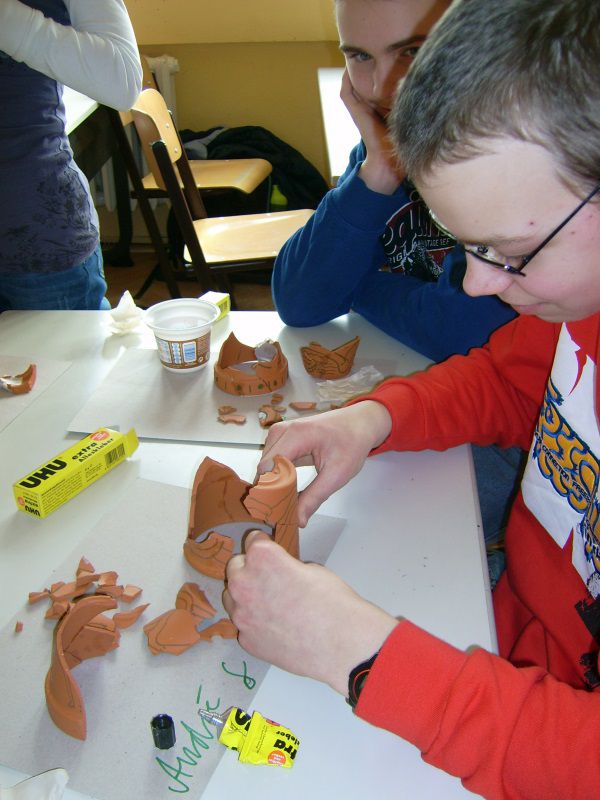 In der Arbeitsgemeinschaft Archäologie werden zur Zeit Keramikgefäße, die vorher nach jungsteinzeitlichen Vorlagen gestaltet wurden und anschließend einem „Zerfallsprozess“ anheim fielen, in mühevoller Puzzlearbeit zusammen gesetzt. Anschließend werden noch detailgetreue und maßstabsgerechte Zeichnungen der Gefäße angefertigt.