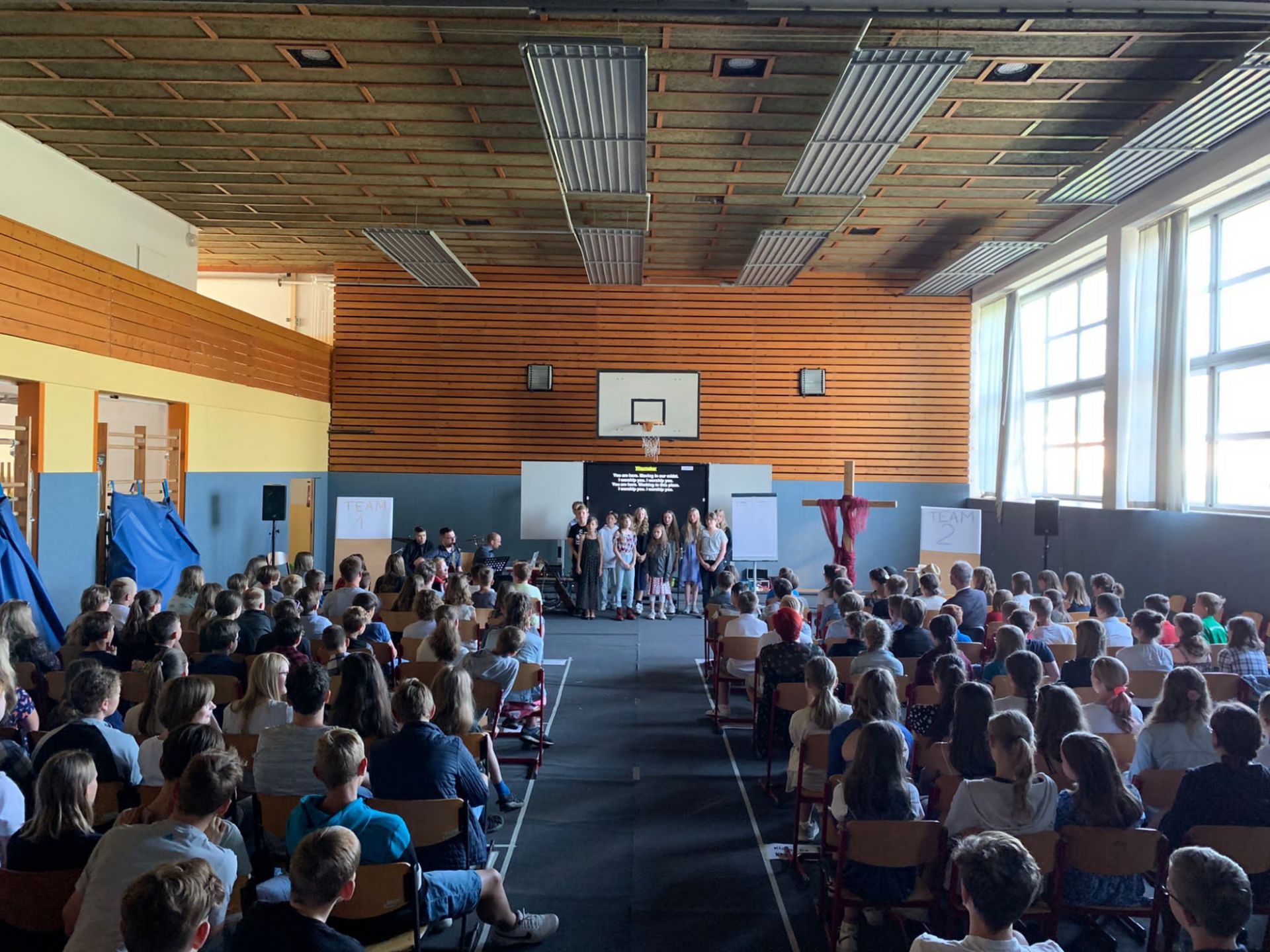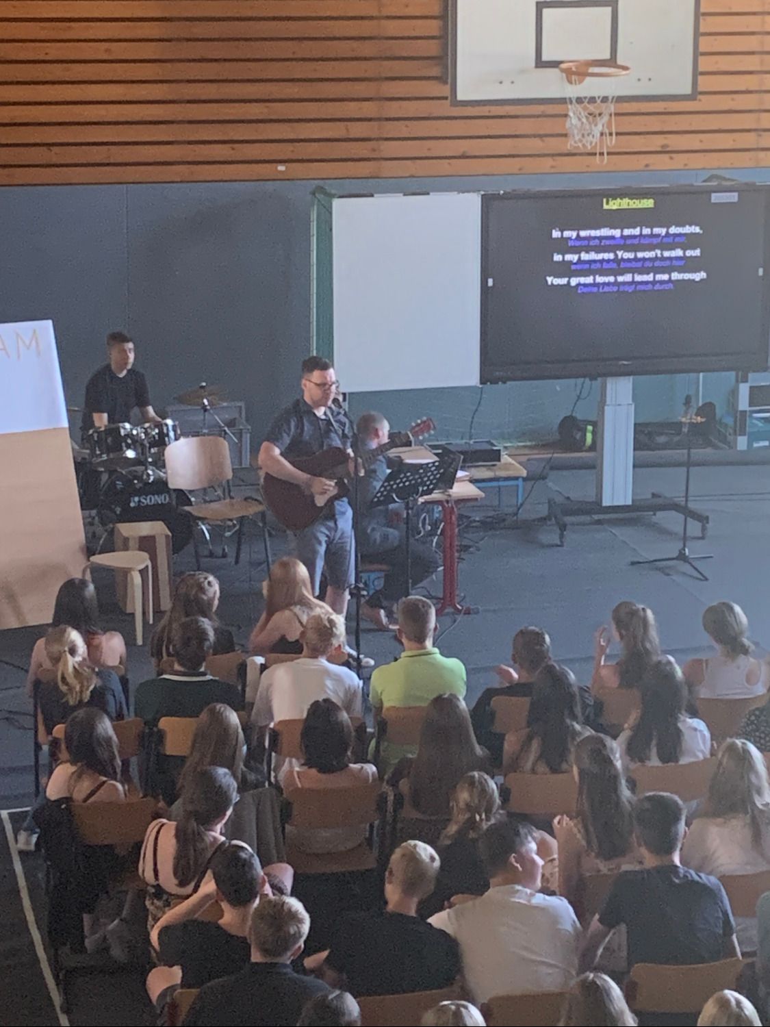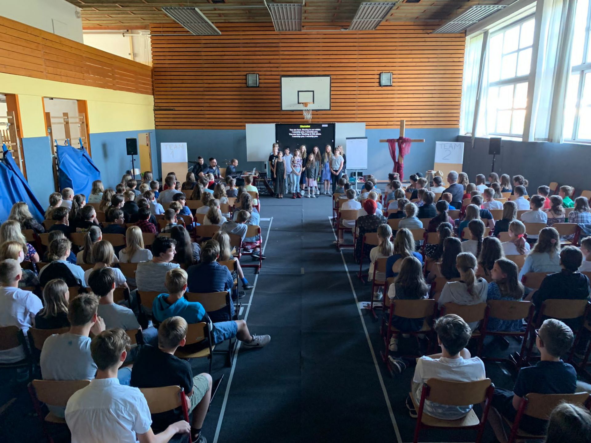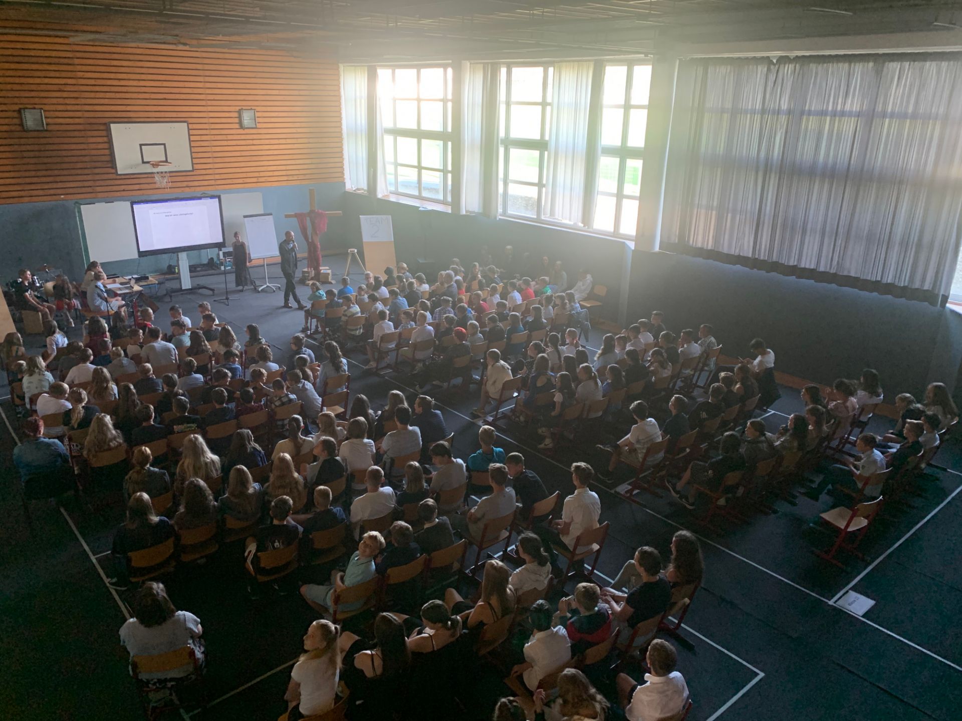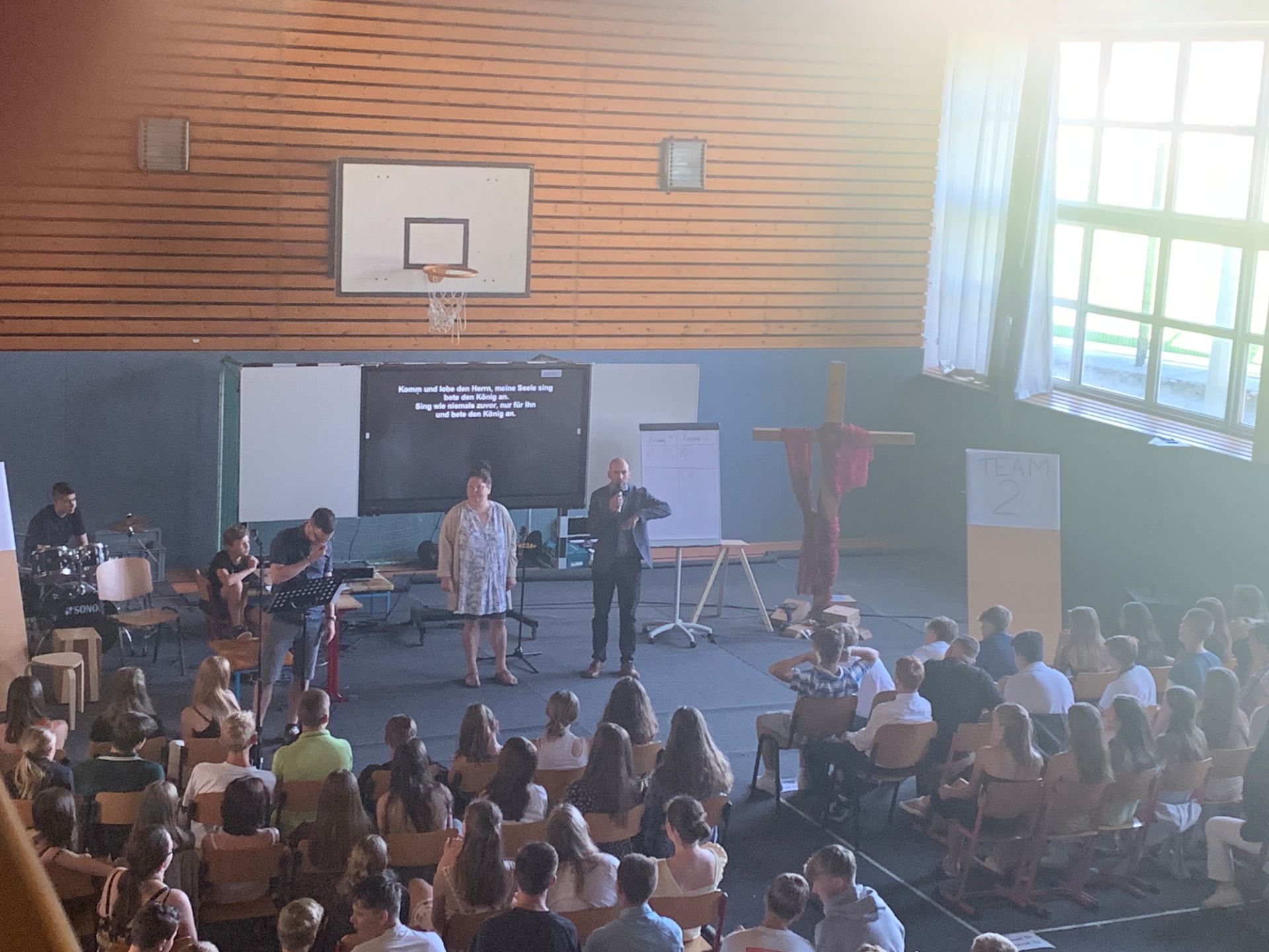 Zur Abschlussandacht spielten wir den Klassiker "Familienduell" als "Schülerduell". Ruben Vorberg demonstrierte dann in seiner Andacht anhand eines dreibeinigen Hockers, dass Jesus die Liebe zu Gott, den Mitmenschen und sich selbst sehr am Herzen lag. Alle drei Standbeine müssen in einem guten Gleichgewicht sein, damit der Hocker, in dem Fall unser Leben, in Balance bleibt. Musikalisch wurde die Andacht von der AG "Bühne frei" ausgestaltet und aus organisatorischen Gründen in zwei Gruppen durchgeführt, während die jeweils andere Gruppe ihre Zeugnisse im Klassenzimmer in Empfang nahm. Hier noch ein paar Bilder: