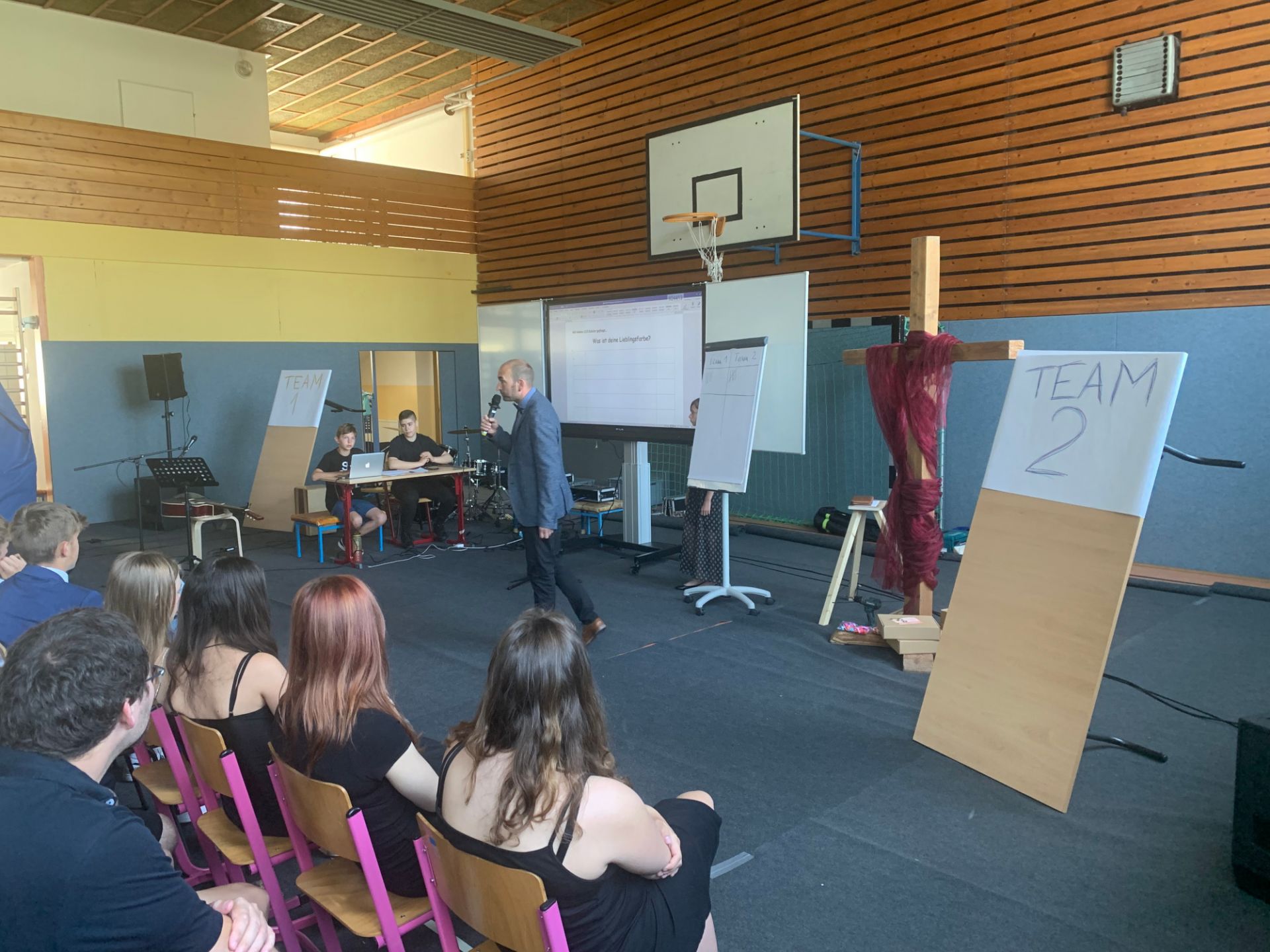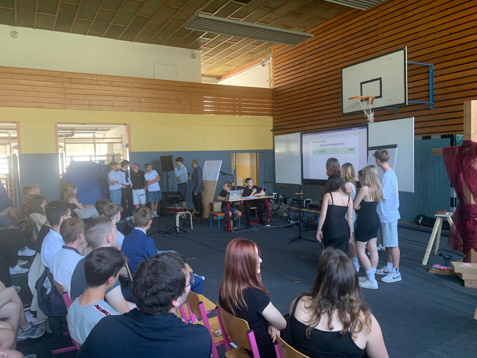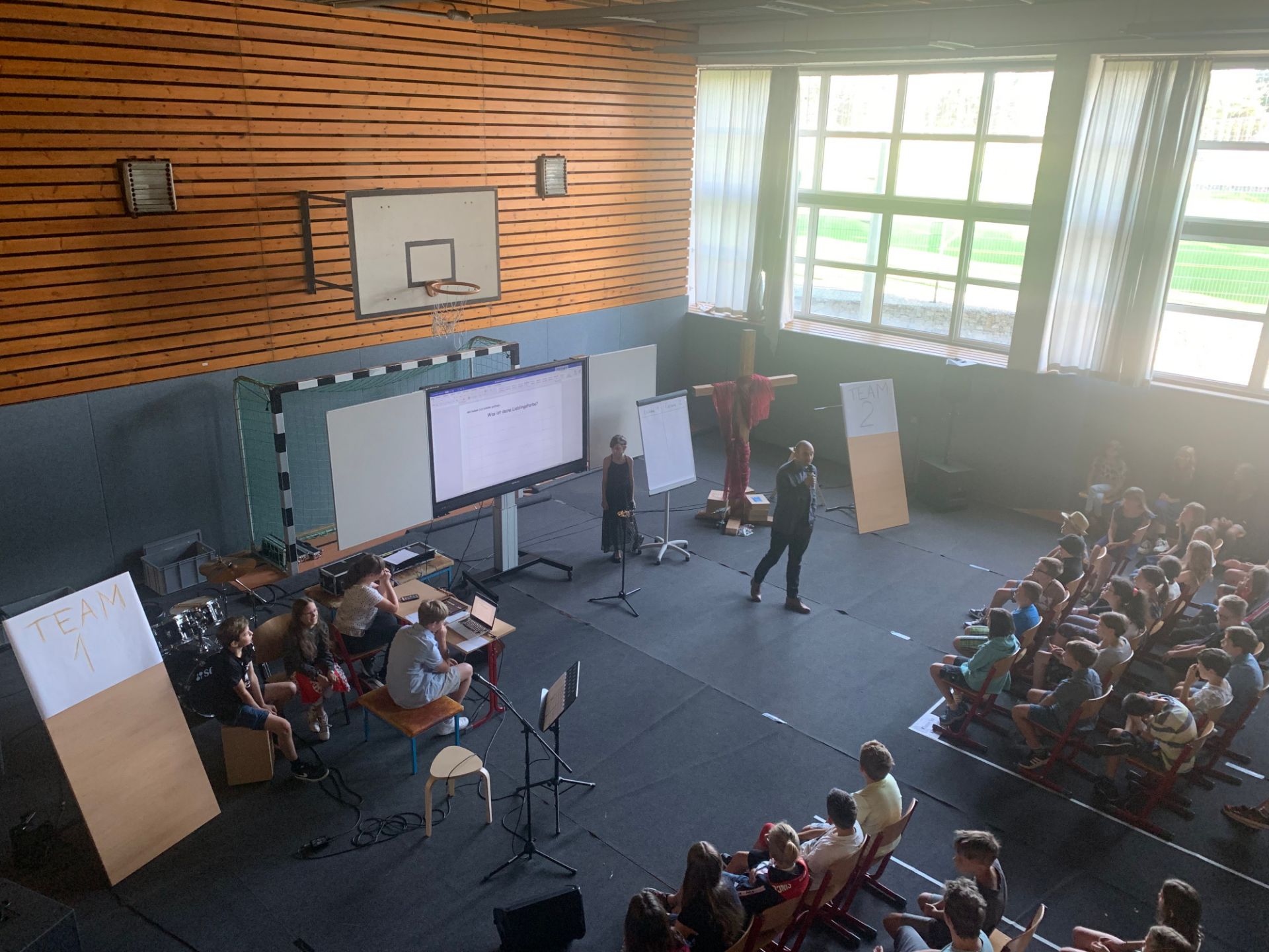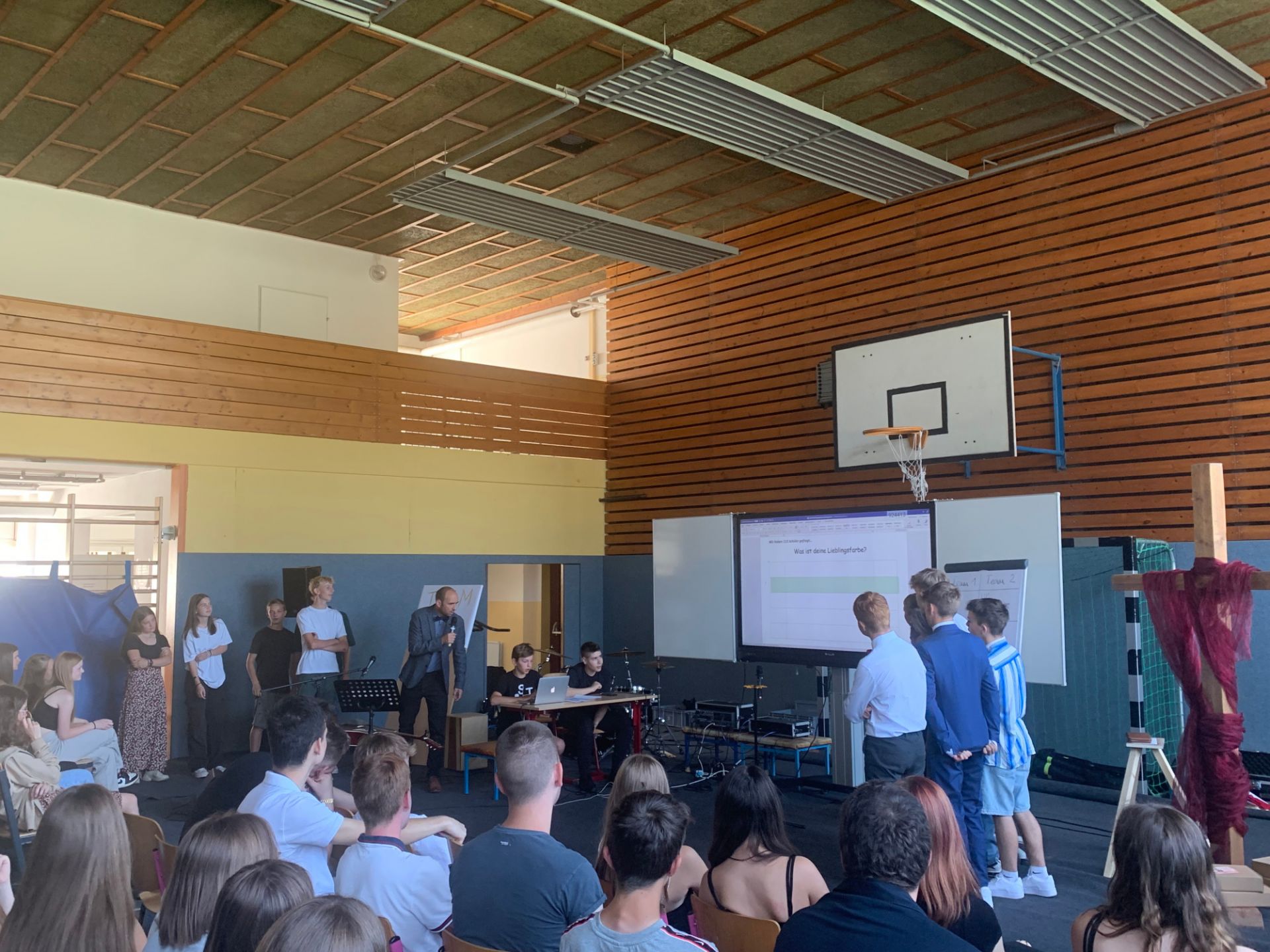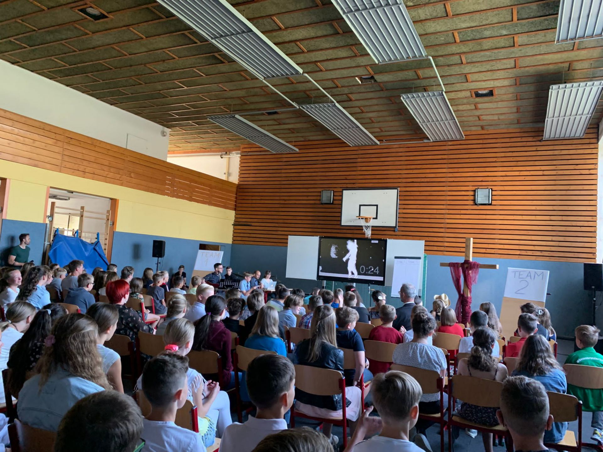 Zur Abschlussandacht spielten wir den Klassiker "Familienduell" als "Schülerduell". Ruben Vorberg demonstrierte dann in seiner Andacht anhand eines dreibeinigen Hockers, dass Jesus die Liebe zu Gott, den Mitmenschen und sich selbst sehr am Herzen lag. Alle drei Standbeine müssen in einem guten Gleichgewicht sein, damit der Hocker, in dem Fall unser Leben, in Balance bleibt. Musikalisch wurde die Andacht von der AG "Bühne frei" ausgestaltet und aus organisatorischen Gründen in zwei Gruppen durchgeführt, während die jeweils andere Gruppe ihre Zeugnisse im Klassenzimmer in Empfang nahm. Hier noch ein paar Bilder: