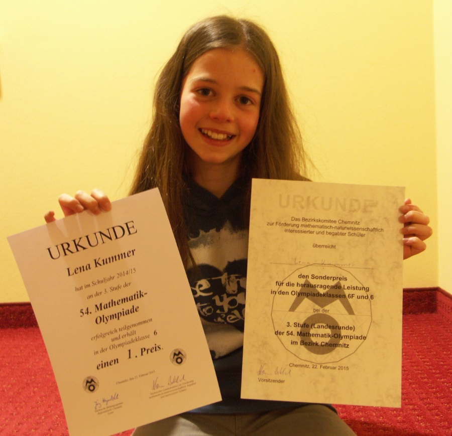 Lena Kummer aus Klasse 6 gewann die diesjährige 3. Stufe der 54. Mathematik-Olympiade, welche an zwei Tagen in Chemnitz geschrieben wurde. In der Klassenstufe 6 nahmen 60 Mädchen und Jungen aus der Region Südwestsachsen teil.
