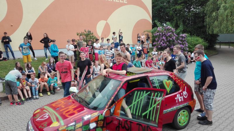 Natürlich feierten wir uns als die Helden der ersten Stunde auch gebührend. Am 31.05.17 fand, zur großen Überraschung von Schülern und Lehrern, unser Abistreich statt. Unter dem Motto „Schlag den Lehrer“ ging es hoch her. Zugeklebte Fenster, bunte Haare für jedermann und ein Programm, was auch die Lehrer an ihre Grenzen brachte – ein voller Erfolg.