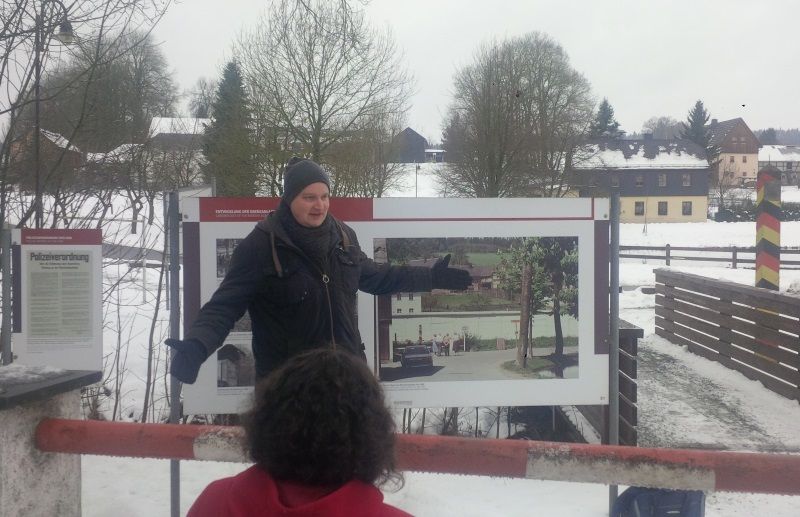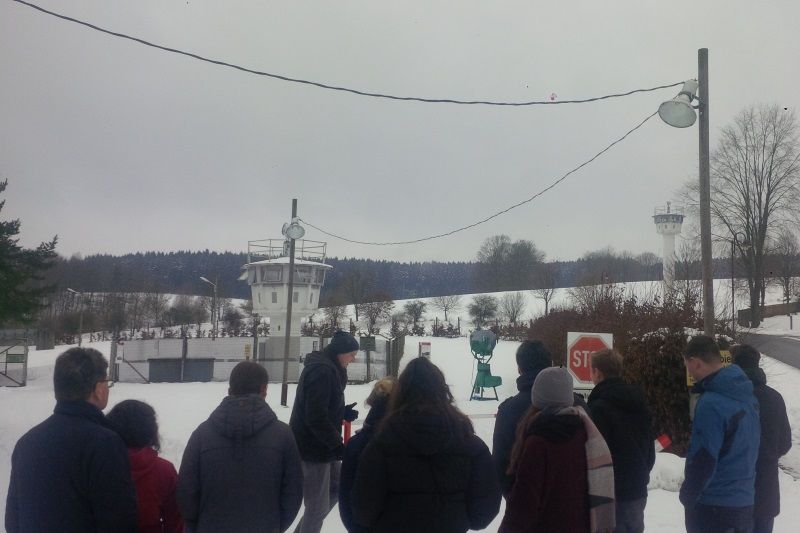 Hohe Grenzzäune, überall warnende Schilder, Schranken und hohe Türme, dazwischen eine mächtige, weiße Mauer – beim Besuch des Dorfes Mödlareuth am 20. Januar 2018 fühlte sich der Leistungskurs Geschichte 11 in die Zeit des geteilten Deutschlands zurückversetzt. Denn der kleine Ort, durch den vor einigen Jahren die innerdeutsche Grenze führte und damit Familien, Freunde und Nachbarn voneinander trennte, hat es sich zur Aufgabe gemacht, seine außergewöhnliche Geschichte weiterzugeben.