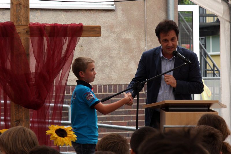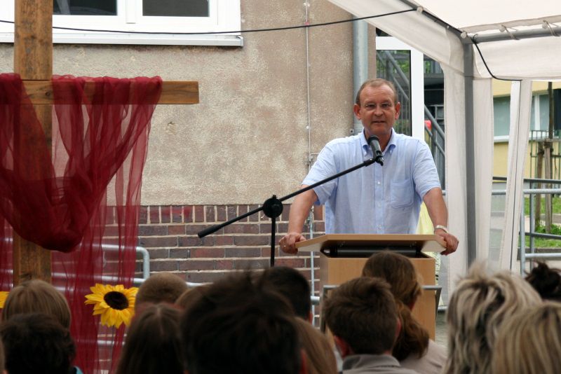 Nach der Begrüßung hielt die Schulleiterin Frau Dr. Willuhn-Wolff kurz Rückschau auf die Höhepunkte des zurückliegenden Schuljahres. Als besondere Gäste konnten wir drei Vorstände der Firma ABUS (August Bremicker Söhne KG aus Wetter an der Ruhr) begrüßen. Die Firma ABUS unterstützt unser Schulprojekt seit der Gründung im Jahr 2009. Herr Hartwig Krauss und Herr Christian Bremicker nahmen die Gelegenheit wahr, im Rahmen des Gottesdienstes ihre Motivation für die Unterstützung unserer Schule zu erläutern und über die Rolle des Glaubens im Alltag und bei ihrer Tätigkeit in der Firmenleitung zu sprechen. Als Gastgeschenk überreichten sie jedem Schüler das Buch „Mit vollem Einsatz“, ein Neues Testament mit Lebensberichten internationaler Spitzensportler.