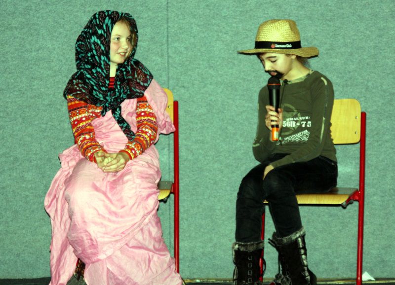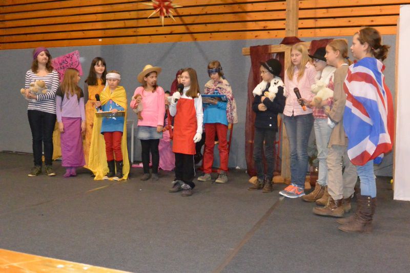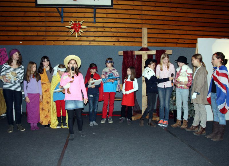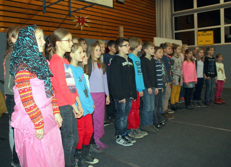 Die Theater-AG führte dieses Jahr das Stück "Die Herodeskids" auf. In dieser modernen Fassung der Weihnachtsgeschichte standen nicht Josef, Maria und Jesus im Mittelpunkt. Vielmehr ging es um die heiligen drei Könige, die eigentlich Sterndeuter waren, und um die Hirten und die Diener, sowie die Gefangenen des Königs. Die Schüler der Klasse 7 trugen Plakate mit den Wünschen der Figuren des Theaterstücks vor. Und jeder konnte nun die Personen ein Stück besser verstehen.