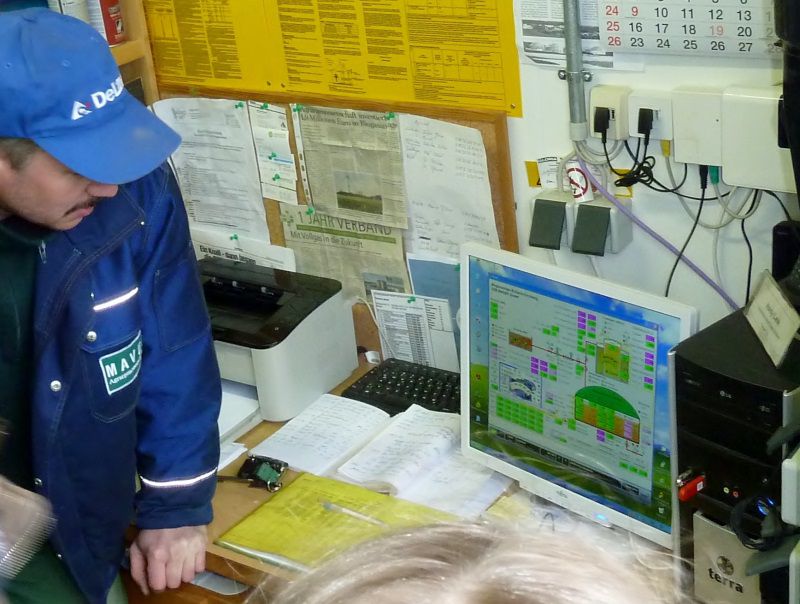 Herr Marcel Kämpf zeigte und erklärte uns sehr anschaulich die 2 Jahre alte Anlage in der ausschließlich aus der Gülle der 1400 Kühe, die in den Ställen gleich nebenan untergebracht sind, täglich 9000 bis 9200 kWh Ökostrom produziert werden. Darüberhinaus wird die anfallende Restwärme genutzt, um die Verwaltungsgebäude der Mavek am Standort Erlbach-Kirchberg ökologisch zu beheizen.
