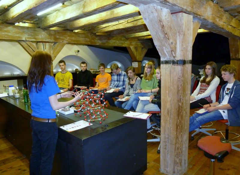 Wie wird aus Quarzsand Glas? Dieser Frage gingen die Schüler der Klasse 9 des Evangelischen Gymnasiums Leukersdorf im Rahmen des Profilunterrichts zum Thema „Der Boden – anorganische Bestandteile“ bei einer Exkursion nach Freiberg in die Ausstellung „terra mineralia“ am Mittwoch, den 30.04.2014, nach. Zwei Studenten der Bergakademie Freiberg gestalteten zu diesem Thema 90 Minuten abwechslungsreichen Unterricht vor Ort mit vielen anschaulichen Beispielen und Gesteinsproben zum Anfassen und Betrachten. Ein kleines Experiment rundete die Unterrichtseinheit ab.