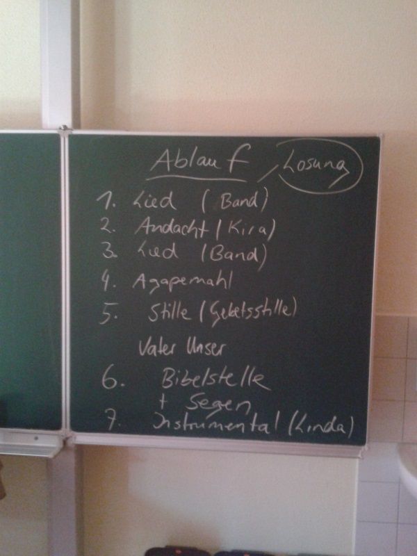 Der Gottesdienst war ein toller Abschluss. Für viele eine Neuheit: Das Agapemahl. Eine Schülerin legte als Predigt sogar das Gleichnis vom Verlorenen Sohn aus (Lukas 15: http://www.bibleserver.com/text/LUT/Lukas15) und spendete am Ende auch noch den Segen!