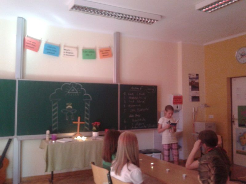 Außerdem gab es in der Vorbereitung auch witzige Vorschläge, wie "den Boden tiefer zu legen". Dies war eine Anspielung auf die Exkursion in die Kirche zu Leukersdorf, die die 5. Klasse am 16.06.2014 ebenso im Rahmen des Religionsunterrichts erlebt hatte.