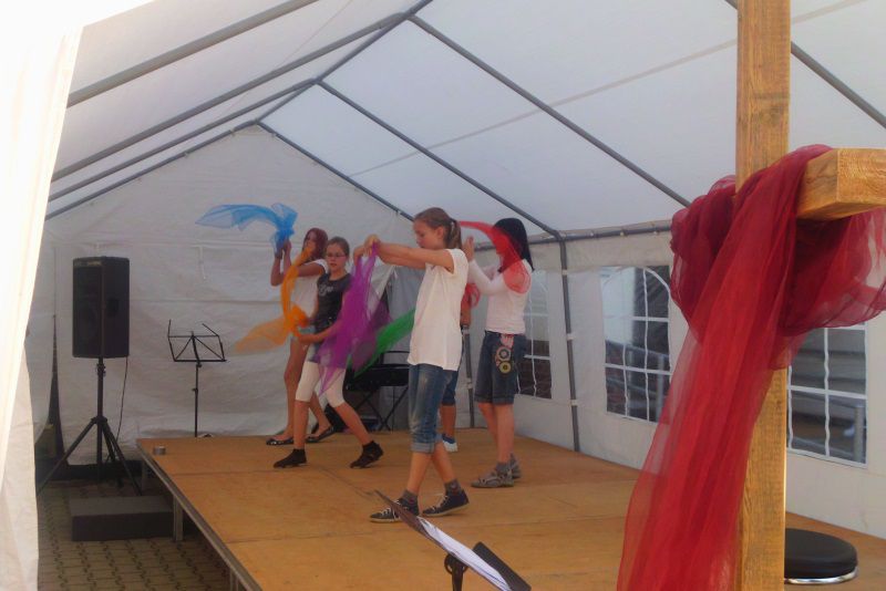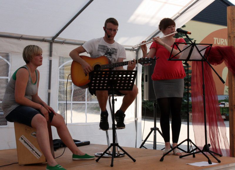 Das Sommerfest wurde 17 Uhr mit einem kleinen Gottesdienst eröffnet, welcher musikalisch von der „Insel-Band“ und der Schülerband ausgestaltet wurde. Inhaltlich ging es in der Andacht von Herrn Geißler um das fünfjährige Jubiläum des Ev. Gymnasiums Leukersdorf. Als Vorsitzender des Ev. Schulvereins Leukersdorf erläuterte er in Anlehnung an den Bahnverkehr wie die „Bildungsreise“ begann. Dabei ging er auch darauf ein, dass sein christlicher Glaube die entscheidende Antriebskraft für ihn und seine Frau war, um das Projekt Schulneugründung zu starten und gemeinsam mit vielen helfenden Händen auf den Weg zu bringen.