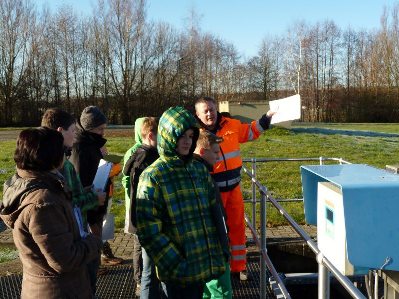Im Rahmen des naturwissenschaftlichen Profilunterrichts geht es im Lernbereich 2 um das Thema „Wasser – Quelle des Lebens“. Als Einstieg in das Thema besichtigten die Schüler des naturwissenschaftlichen Profils der 8. Klasse am 09.12.2014 die Kläranlage der WAD-GmbH in Niederdorf. Gemeinsam mit den Profillehrern Frau Siegel und Herrn Götz ließen sich die Schüler die komplexen Zusammenhänge der mechanischen und biologischen Klärung unserer Abwässer vom zuständiger Leiter der Kläranlage, Herrn Thomas Conrad, fachkundig erklären. Die vermittelten Informationen werden dann im Unterricht ausgewertet und weiter vertieft.