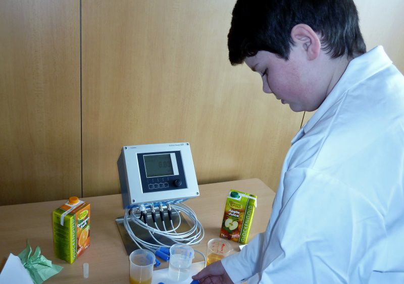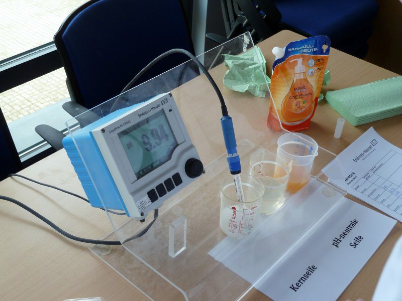 Anschließend führten die Schüler, selbständig interessante, protokollierte Experimente zur pH-Wert-Messung an verschiedenen Lebensmitteln und Seifen durch. Dabei wurden in Waldheim gefertigte, Sensoren eingesetzt. Nach einer Auswertung mit der Erkenntnis, das Cola mit einem pH-Wert von 2,5 die mit Abstand sauerste Flüssigkeit bei diesen Experimenten war, wurde begründet welche Säuren diesen sauren pH-Wert verursachen.