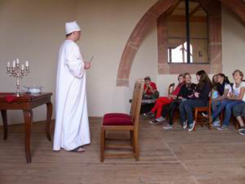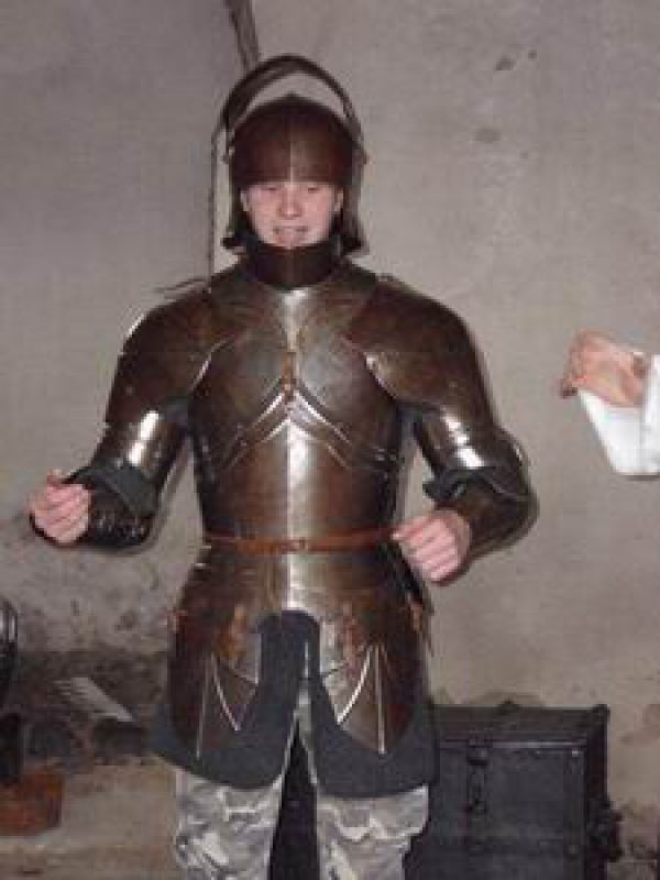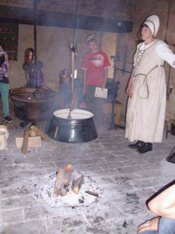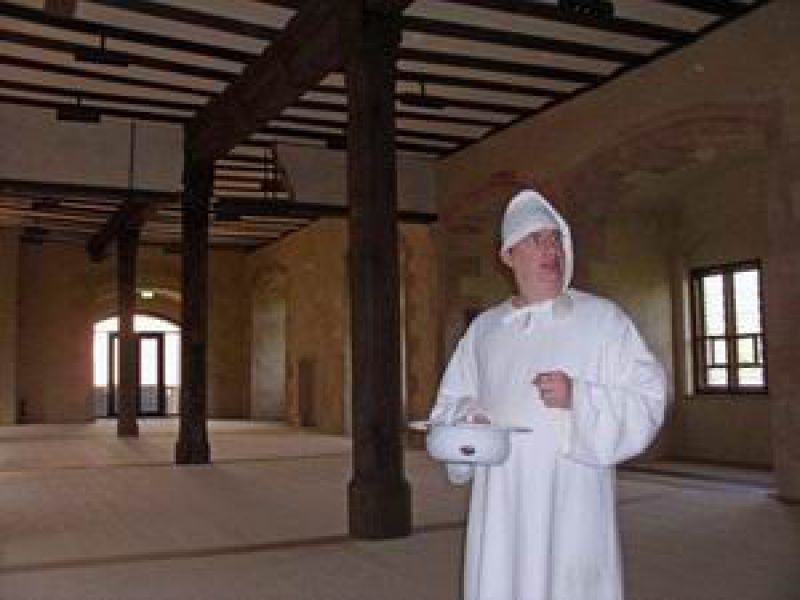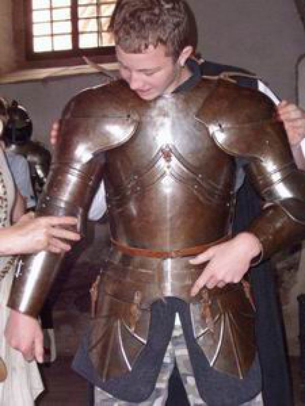 Sehr anschaulich erklärte ein freundlicher Herr im Nachthemd und Nachttopf die wirklich „wichtigen“ Dinge des mittelalterlichen Alltags – vom Aufstehen mit dem ersten Hahnenschrei bis zum Zubettgehen bei Sonnenuntergang. Köchin „Gertrude“ führte uns durch die große Schlossküche. Ein geschmackvoller Eintopf mit vielen Zutaten (außer Mais, Tomate und Kartoffel) füllte die größten „Löcher“ im Magen. Und für unseren Helden Richard kam die Stunde der Wahrheit: Kann er die schwere Rüstung tragen? Oder muss ihn sein Knappe stützen…? Letztlich hat jeder die Gegenwart wieder erreicht und ist vielleicht ein wenig froh, im 21. Jahrhundert zu leben…?!