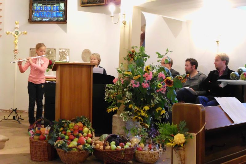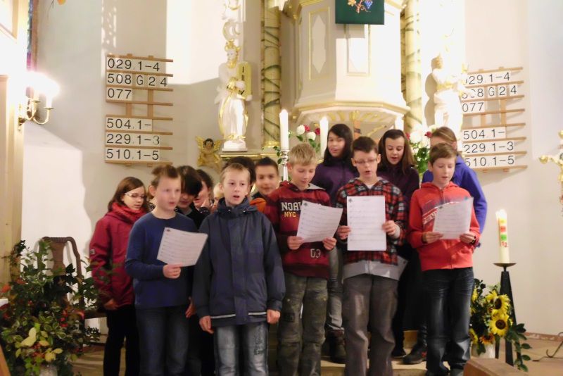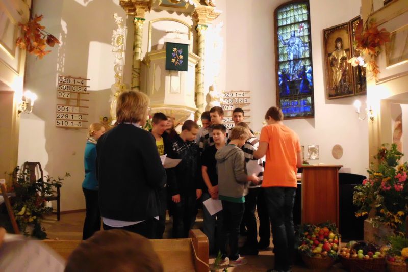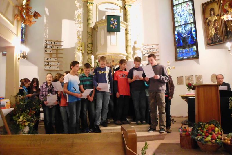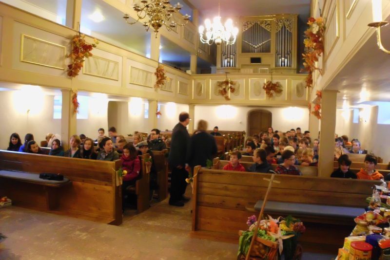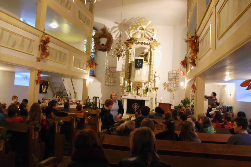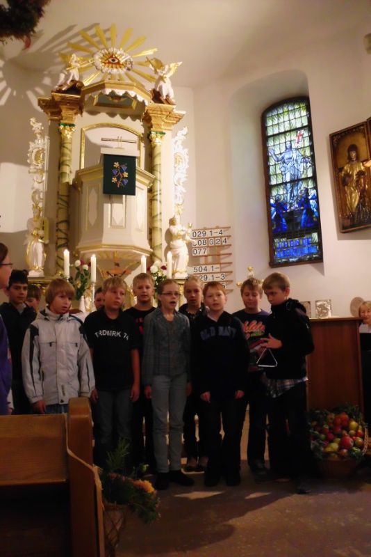 Nach einem Marsch von 71 Schülern durch den Ort versammelte man sich in den Bänken der festlich geschmückten Kirche. Pfarrer Hanitzsch hielt eine kurze Predigt, Herr Böhm begeisterte mit seinem Fachwissen zum Thema Erntekranz und jede Klasse bereicherte die Ernteandacht mit einem musikalischen Beitrag.