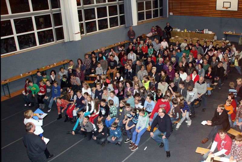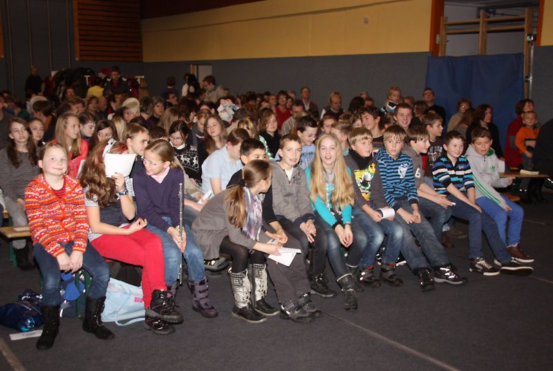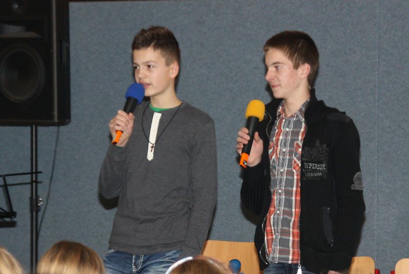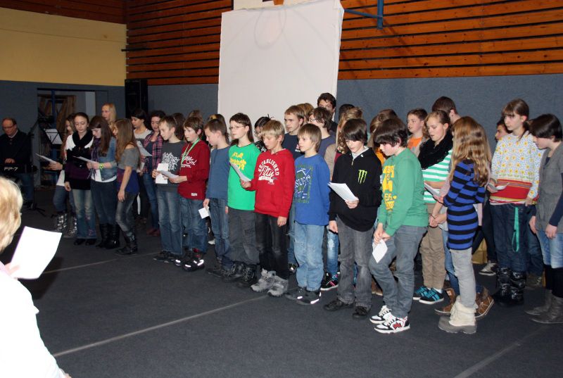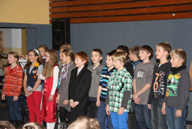 Mit erzgebirgischer Mundart brillierten 2 Schüler der 8. Klasse. Dazu gehörte natürlich das gemeinsam gesungene „Rachermannl“. Der Schülerchor begeisterte die Gäste mit dem Lied „Der kleiner Trommler“.