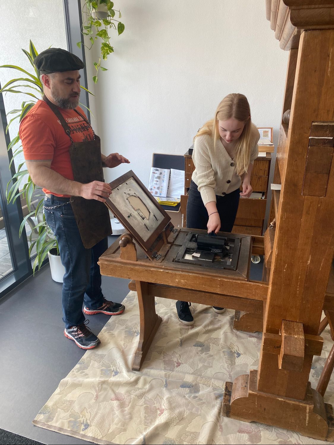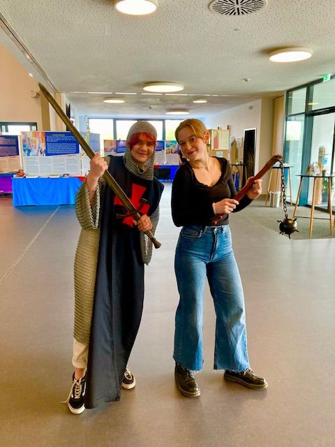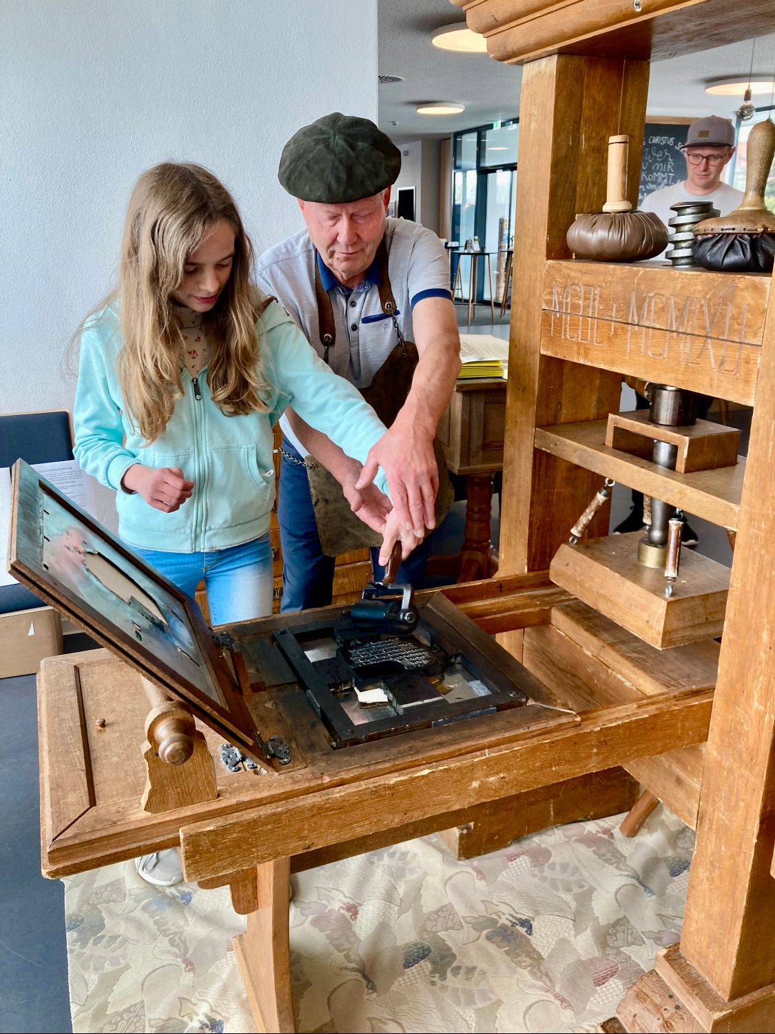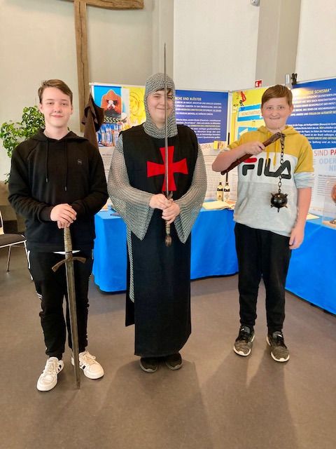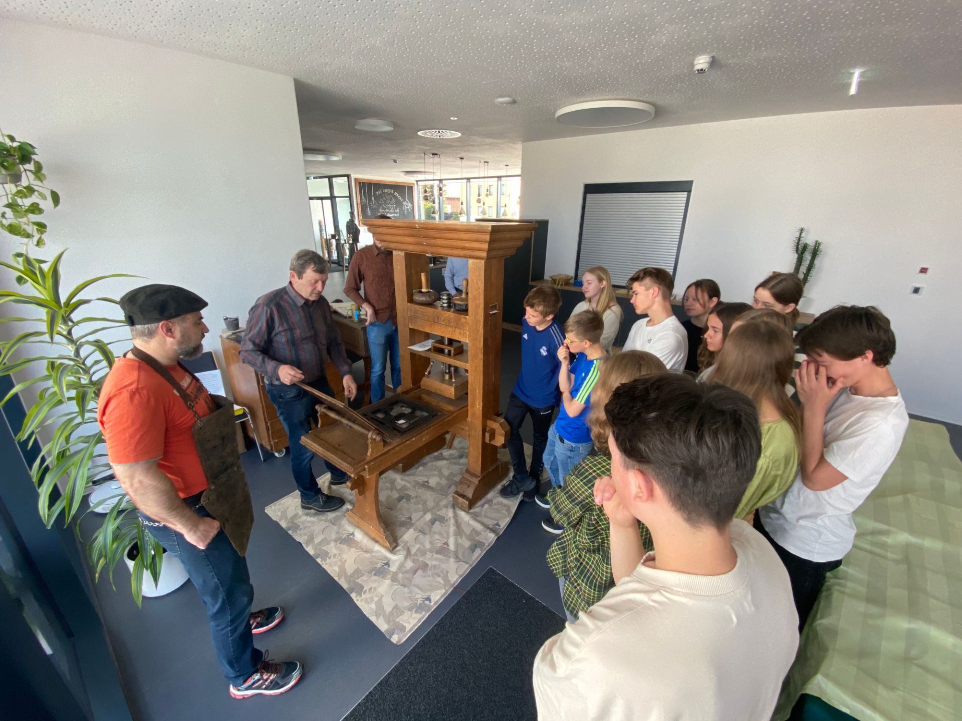 An einer nachgebauten Druckerpresse von Johannes Gutenberg konnte jeder Schüler einen Einblick in die damalige Arbeitswelt gewinnen und im Anschluss seinen eigenen Bibeltext drucken. Dabei kam es nicht nur auf Präzision an, sondern auch auf die nötige Kraft beim Betätigen des Druckhebels. Auch an anderer Stelle waren Muskeln notwendig, denn das Schwert und Kettenhemd eines Kreuzritters hatte es wirklich in sich.