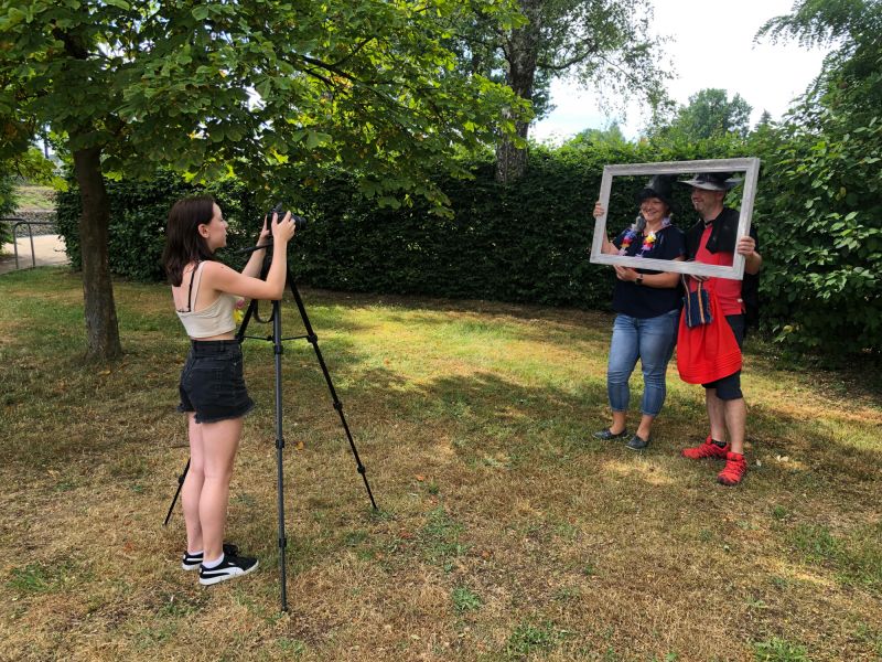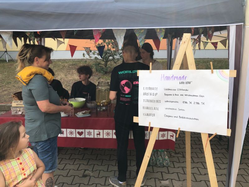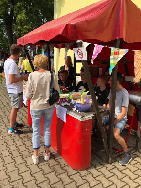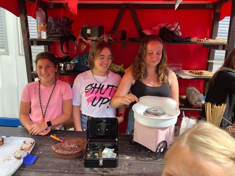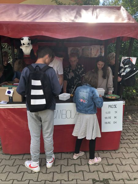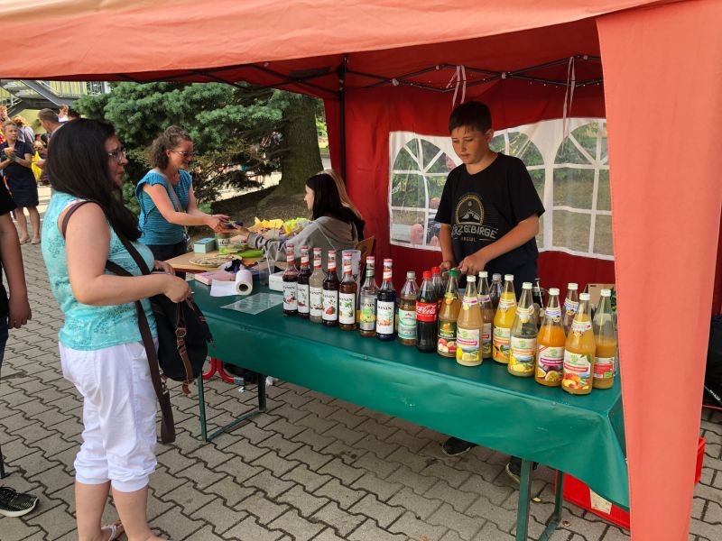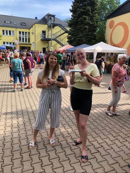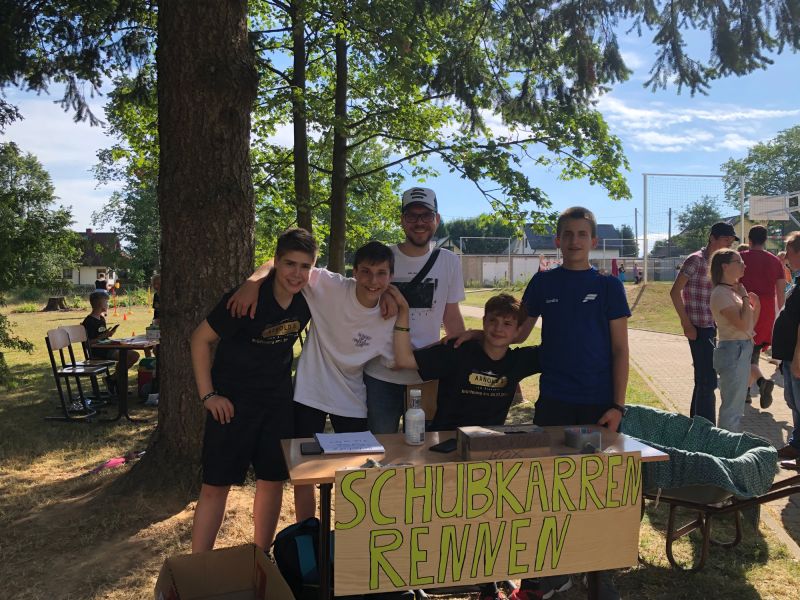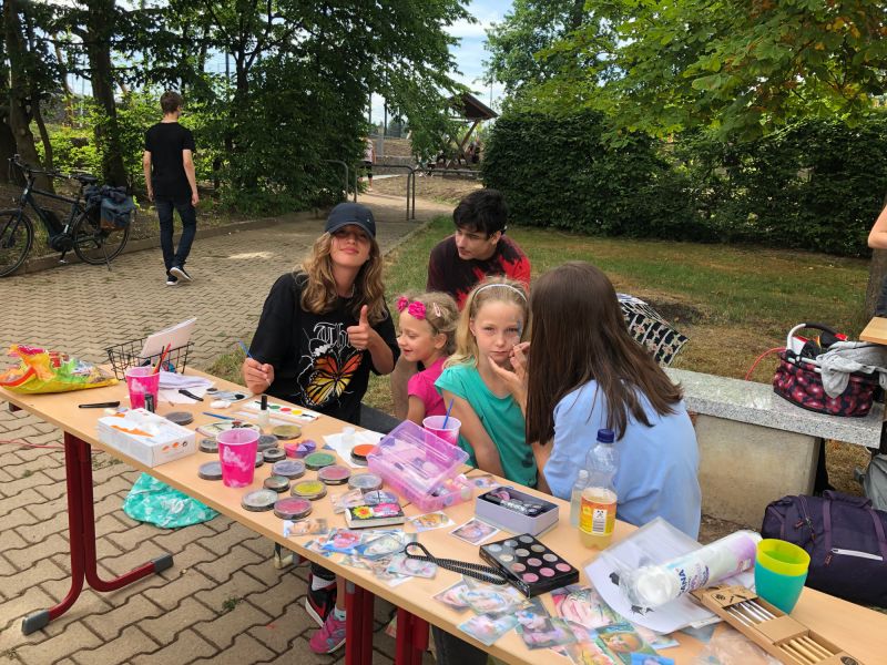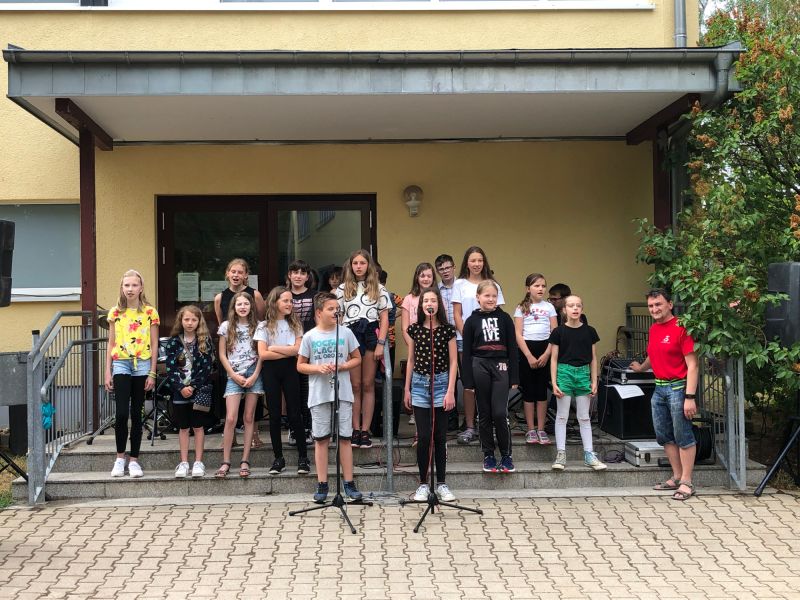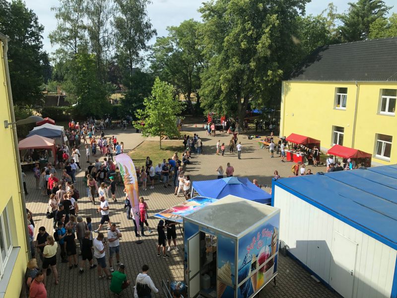 Im Anschluss an den Sponsorenlauf fand bei strahlendem Sonnenscheit nach zwei Jahren Corona-Pause erstmals wieder eine gut besuchte, öffentliche Veranstaltung statt: Das Sommerfest. Zahlreiche Stände boten nicht nur kulinarische Köstlichkeiten an, sondern auch Spaß und Unterhaltung. So konnte man beispielsweise erneut seine sportlichen Fähigkeiten beim Schubkarrenrennen oder derm Fußball-Parcours unter Beweis stellen oder witzige Fotos mit verschiedenen Kostümen machen, die sofort ausgedruckt und mitgenommen werden konnten. Außerdem diente die kleine Treppe zur Turnhalle mit Vordach als Bühne auf der verschiedene musikalische Beiträge präsentiert wurden. Sogar die Feuerwehr rückte an, wenn auch nicht im Einsatz!