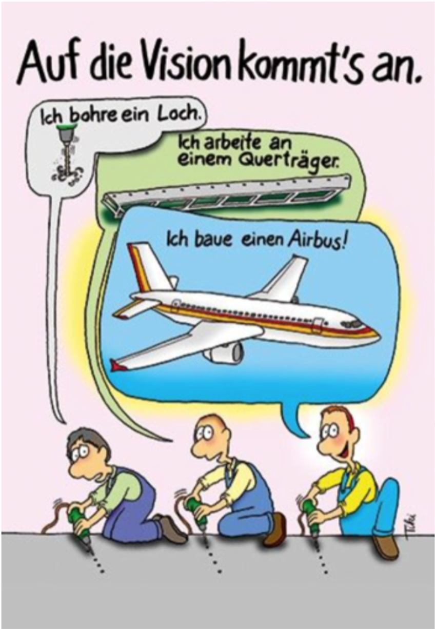 Im Laufe seiner Andacht versuchte Ruben Vorberg zu verdeutlichen, dass Gott mit jedem Menschen einen Plan hat; dass jeder Mensch seinen Ursprung, seinen Sinn und sein Lebensziel in Gott finden darf. Gott möchte uns eine größere Perspektive auf unser Leben geben, was sehr gut in der Karikatur von Werner "Tiki" Küstenmacher zum Ausdruck kommt. Alle drei Arbeiter verrichten diesselbe Tätigkeit, aber nur einer hat einen Blick für das große Ganze; weiß, dass sein letzgültiges Ziel darin liegt, einen Airbus zu bauen. Was ist Ihr "Airbus", den Sie gerne bauen möchten?